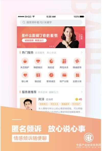 对用户而言,这是一款可以提供匿名倾诉、心理咨询、情感交流的APP。平台聚集了大量职业的情感及心理专家,为用户的恋爱、婚姻、家庭关系、亲子关系、两性问题、职场生存等十大主要门类提供一对一的在线咨询指导服务。
