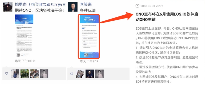 此前,ONO创始团队对外宣布将于2018年6月使用EOS.IO启动ONO主链,通过ONO DAC机制运营管理社区,避免社区分裂。此举获硬币资本创始人李笑来和雄岸基金负责人姚勇杰关注及看好,并主动发布朋友圈力挺。