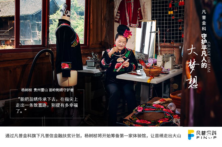 贵州雷公山下的杨树桢正是这一计划的受益者之一。2008年之前,杨树桢一直辗转在各个城市的工厂,做过鞋子、茶叶。为了孩子的教育问题,杨树桢决心回到家里创业。现在,杨树桢的苗绣销往了贵州、上海、广东等许多地方。“可以送孩子上下学,亲自给他做饭,还能时时关心着父母,最主要的,生活有可观的收入,这让我很幸福。”杨树桢说,她希望在凡普信公益性小额信贷信息服务项目的帮助下,能够让苗绣文化传递到更广阔的土壤中。