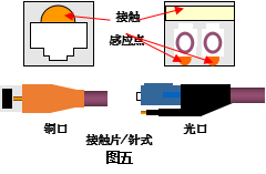 该技术如图五所示,在铜口和光口上都可使用。接口下部或上部有铜感应点/带,跳线护套上有铜触针/触片。跳线插入接口后,跳线触针/触片接触接口的感应点,链路形成回路,拔出跳线时链路断路。依靠这个原理,我们就可以实时监测跳线的插拔和端口的对应关系。