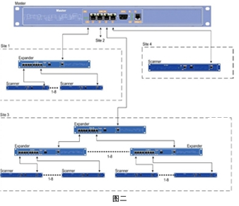 早期的电配主要采用集中式管理架构(如图二所示),每个相邻的配线架都接到一个管理扫描器,然后所有的管理扫描器都上联并汇总至中央管理器统一控制。