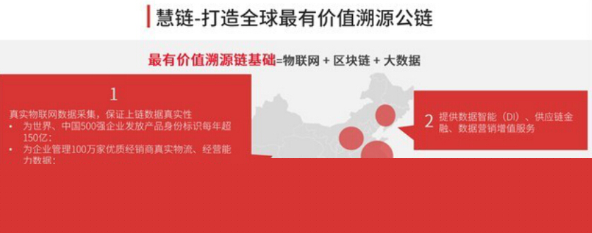 打造最有价值的溯源链,物联网、区块链和大数据缺一不可。慧链首先为世界以及中国500强企业发放产品身份标识每年超过150亿;其次还为企业管理100万家优质经销商真实物流、经营能力数据;积累超过5000万+的高附加值产品消费能力人群的消费数据;而且所有的数据贯穿白酒、医药保健品、农资、母婴等行业,这些是确保慧链成为全球最有价值溯源链的技术基础。另外,慧链还在为用户提供数据智能(DI)、供应链金融、数据营销增值等服务,提升企业运营效率。