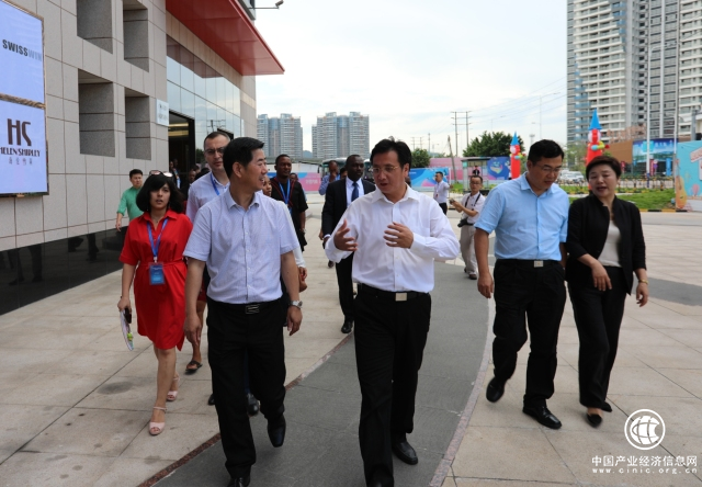 ▲来访国嘉宾参观考察花都圣地环球商品贸易港和圣地皮具品牌展览中心