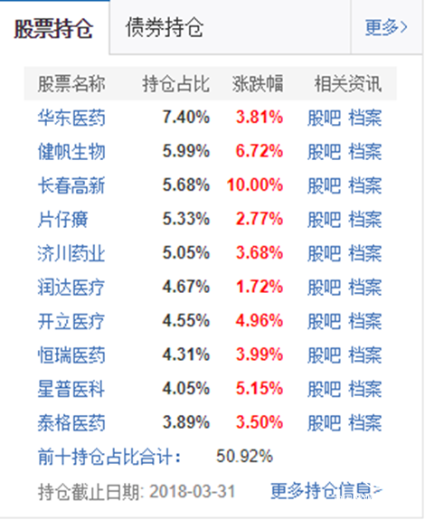 招商医药健康产业股票的赚钱思路也是如此。个股方面,根据其 1季度公布持仓前十的个股分析,其中恒瑞医药(600276)、片仔癀(600436)、长春高新(000661)等这两个月涨幅高达百分之五六十,高频出现在半年收益率排名靠前的股票型基金中,是明星中的明星。其它几只个股,虽然不是各个受高度关注,但在各自细分领域表现突出,估计也默默为这只基金贡献了较好回报。