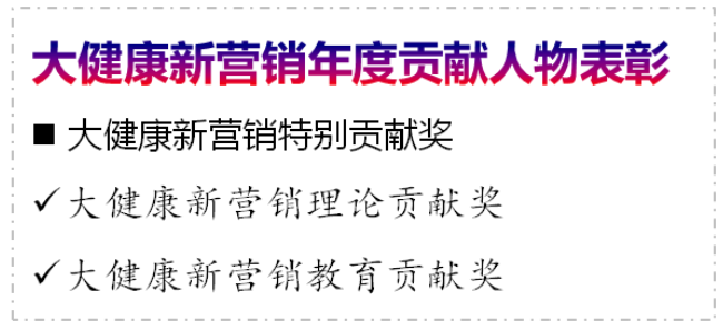 大健康新营销特别贡献奖作为峰会特设奖项,大健康新营销年度贡献人物表彰环节,将从行业各细分领域推举并评选出,为行业的改革发展和社会进步作出突出贡献的杰出人物。他们中既有锐意进取的先行者,也有推动学术营销的带头人;既有模式创新的攻坚跋涉者,也有文化建设的引领者。本届峰会将荣耀颁发大健康新营销理论贡献奖、大健康新营销教育贡献奖两项大奖。