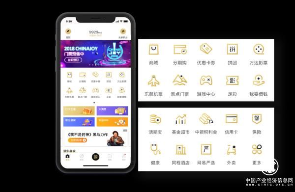 新版APP最直观的变化就是将旧版本的“首页”、“发现”、“购物”、“我的”四个频道页,变成了“首页”、“发现”、“畅由付”、“钱包”、“我的”五个频道页。原本占据首页中心位置的“积分管家”版本不再保留,功能并入了“钱包频道”。整体视觉上更加时尚简约,进入各个分区的功能按钮从原本五彩的圆徽章形态,变成了更符合当下用户审美的扁平极简约的线条图形,原本卡片式Banner统一优化成了轮播形式。通过功能的整合,页面信息得到了提炼,产品功能板块更加鲜明,整体界面更显简约大气。