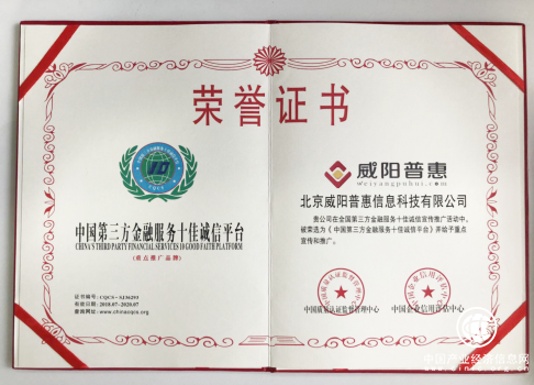 为进一步加快推进行业内的诚信金融体系建设,营造优良诚信的互联网金融经营环境,在中国质量认证监督管理中心、中国企业信用评估中心在的宣传推广活动中,威阳普惠荣获“中国第三方金融服务十佳诚信平台”。