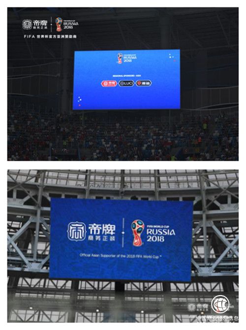 2018年,区域赞助商在世界杯首次出现,这来源于因凡蒂诺上任国际足联主席后的创收改革。作为第三级别的赞助商,中国品牌帝牌商务正装和雅迪电动车、指点意境一起亮相在俄罗斯世界杯球场上。这三位世界杯的“新人”跟海信、蒙牛、万达等不一样,他们并没有用铺天盖地的广告来宣告自己的赞助行为,甚至,帝牌商务正装并没有选择在大众传媒上投入巨资来进行高频率曝光。