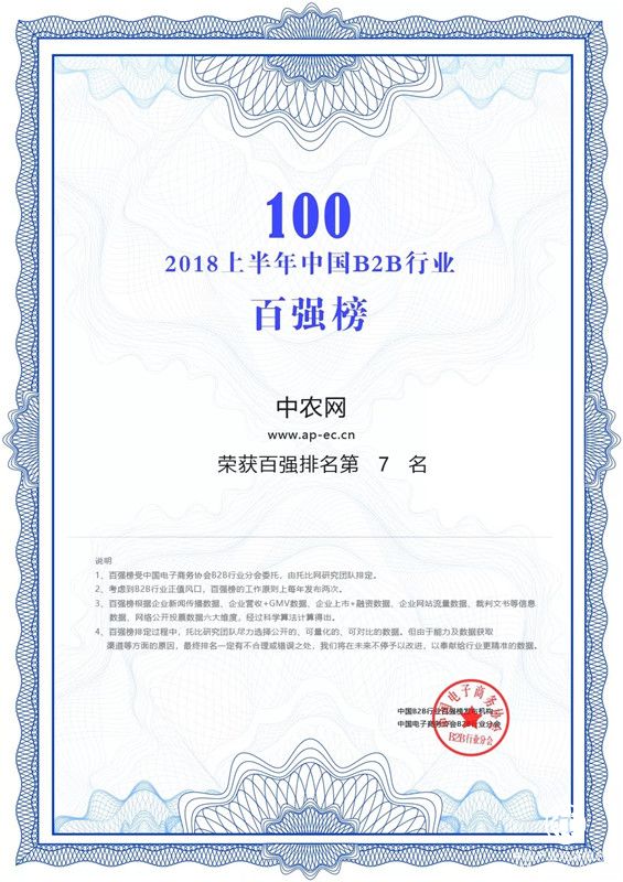 2017年中农网主营业务收入达326亿元,利润达1.56亿元,其中2017年中农网平台上的白糖现货流转量约630万吨,占全国总量的三分之一。全国90%以上的白糖行业用户和30%以上的茧丝行业用户成为交易会员,中农网已经成为了白糖、茧丝品种的行业资源配置中心及行业定价风向标。此次入围是中农网连续第三年入选中国B2B企业百强榜单。此外,中农网亦荣获“2018中国农业互联网先锋企业”大奖。