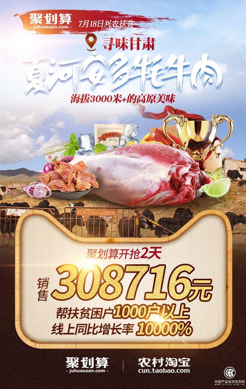 7月18日,在甘肃省甘南夏河县美丽的桑科草原举办了一场隆重的启动仪式,由甘肃省商务厅和阿里巴巴聚划算生鲜、农村淘宝联合发起的“亩产一千美金计划”, 解决当地特色农产品价格低、销路窄的困境,实现“兴农扶贫”。当天活动中,“安多集团”的牦牛腱子肉与“壹号餐桌”集团强强联合,在“缘琳山食品旗舰店”一场活动销售了30多万元!同时也有来自26个县区的特色农产品得到重要的展示以及销售机会,流量巨大,曝光度高,机会难得。这样的契机,对于县域农产品而言,无疑是一次绝好的推广机遇。