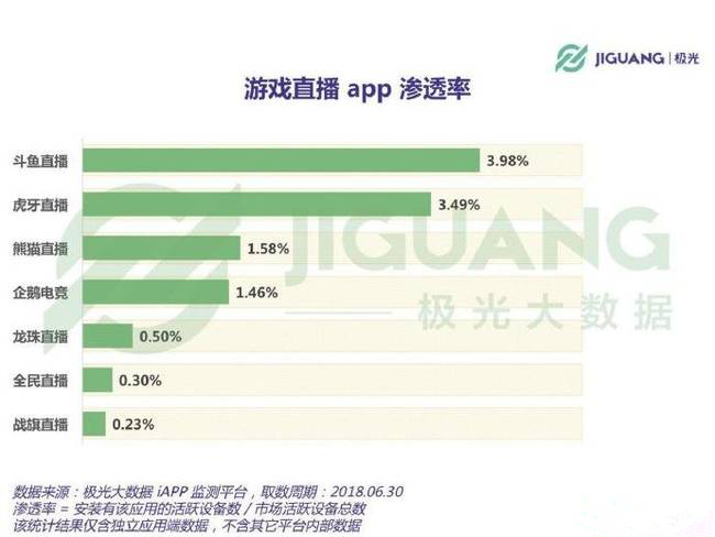 近日,极光大数据发布了截止至6月30日的2018年第二季度数据,数据直接显示,游戏直播app渗透率上,斗鱼以3.98%的数据一骑绝尘,成为行业翘首,随后是3.49%的虎牙,以及第二梯队1.58%、1.46%的熊猫直播和企鹅电竞。近3个月的月活数里,斗鱼也与处于第二名的虎牙拉开近700万的差距,稳居游戏直播第一平台的地位。