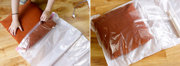 Step 2:放置衣物。挑选了一个厚度约为5cm的抱枕将它放在了小号收纳袋中。