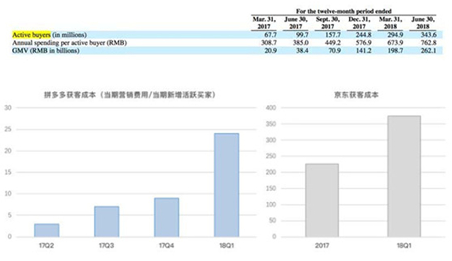 微信流量的的另一个优势是获客成本极低、且熟人关系销售转化高。通过招股书计算,拼多多过去四个季度单个客户获取成本分别为3元、7元、9元和24元。2018Q1由于广告投入大幅增加,单客成本翻了三倍。但对比京东,不及其1/10。
