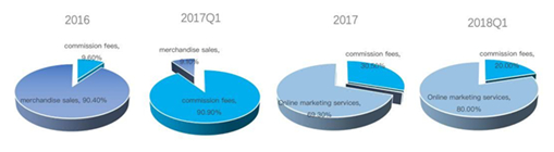 从招股书看,2016年(拼多多和拼好货合并于9月),拼多多90%收入为商品销售收入。而2017Q1,拼多多的主要收入为交易佣金,占比超过90%,商品销售收入仅剩9%。真正让收入起飞的是从2017年4月上线的线上推广服务开始,不再依靠商品销售收入,业务全面向服务转型。