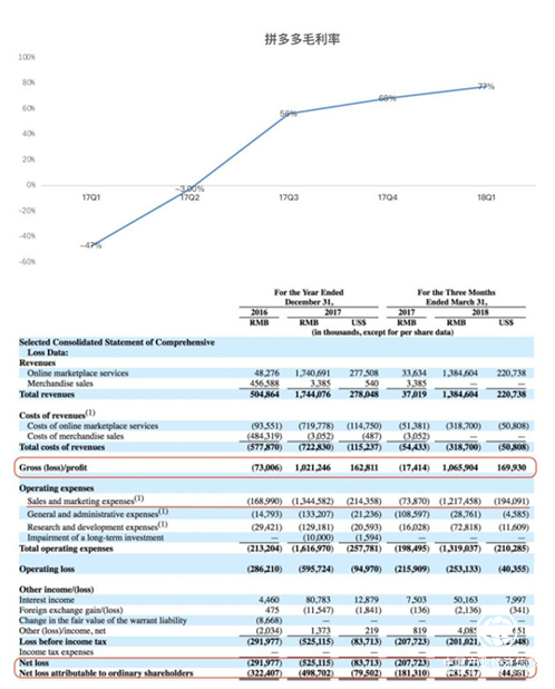从招股书看,拼多多的收入分为线上平台服务费和商品销售收入,线上平台服务费是包括线上推广服务费和交易佣金,模式跟淘宝天猫如出一辙。商品销售费主要是之前拼好货留下的自营商品收入。
