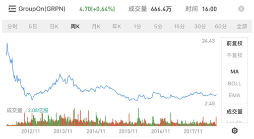 起初,拼多多主打的两个点:1)实惠拼团,2)限时秒杀。拼团美国早有团购鼻祖Groupon,显然,拼多多不想被称为团购网站,Groupon的走势如下惨烈,犹记得当年千团大战的潮起潮落,从2010年团购网站迅速崛起,不到3年销声匿迹或改头换面,如果美团还是个团购网站,不会有今天的美团。