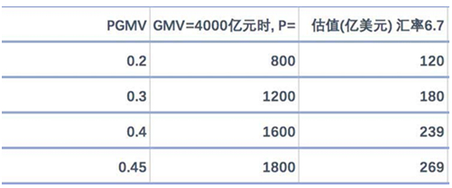 根据拼多多招股书,2017年实现GMV1412亿元,2018Q1GMV662亿元,假设2018年增长如预期,2全年GMV将达到4000亿元,则对应的估值如下:
