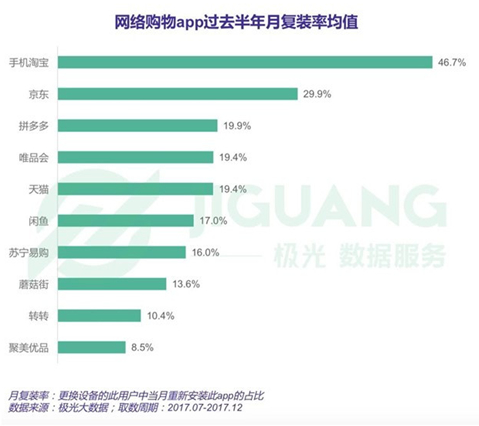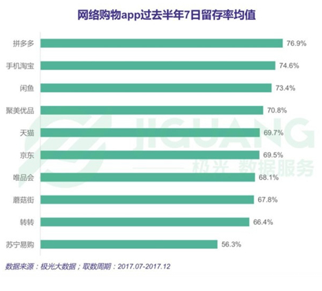 根据极光大数据的调查显示,2017年下半年,拼多多的7日留存率均值76.9%,处于行业领先地位,但其月复装率19.9%,较淘宝的46.7%差距较大,同样落后于京东的29.9%。