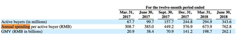 拼多多更新招股书显示,自2017Q1至2018Q2,每个活跃买家的年消费额以此为人民币308.7、385、449.2、576.9、673.9、762.8元。