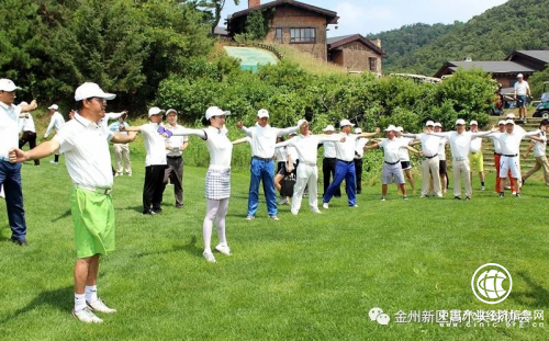随后,全体参赛选手来到红旗谷高尔夫出发台前的练习果岭旁,在高尔夫专职教练员的带领下做高尔夫下场前的预备运动,活动臂、腕、腰、膝、腿等各个部位,为下场打球做好热身准备。