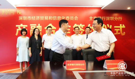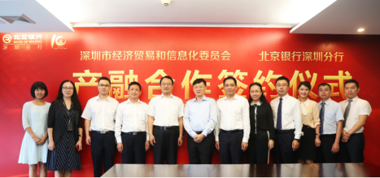 为贯彻落实《国务院关于深化制造业与互联网融合发展的指导意见》(国发〔2016〕28号)和《中国制造2025》(国发〔2015〕28号),按照《深圳市人民政府办公厅关于印发深圳市推进国家产融合作试点城市建设工作方案的通知》(深府办函〔2018〕24号)的要求,强化金融对产业的支撑作用,2018年7月25日,深圳市经济贸易和信息化委员会与北京银行深圳分行举办“产融合作”签约仪式。市经贸信息委副主任高林、预算监督处处长刘云红、深圳市中小企业服务署副署长冯德崇、北京银行深圳分行行长区瑞光、副行长张国都等出席仪式。