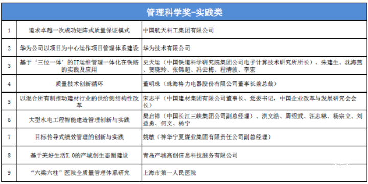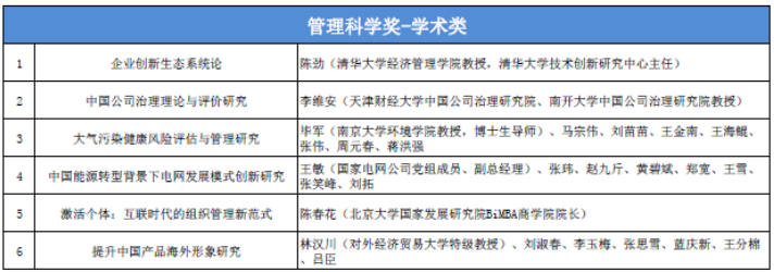本届管理科学奖,通过激烈的提名和竞争,共计评选出管理科学奖15项,其中学术类 6项,实践类9项;管理科学奖专项奖30项;管理科学奖入围奖29项。