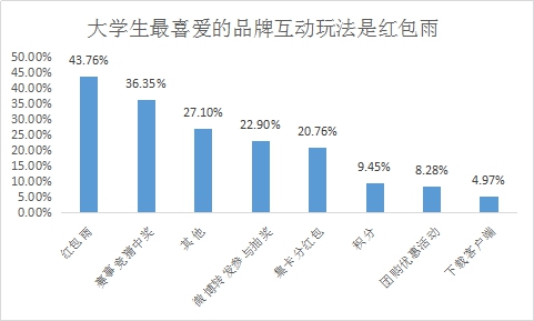 在世界杯期间,各品牌采取了多种多样的互动玩法吸引消费者进行沟通,43.76%的受访者最喜欢参与的是红包雨,其次是参与赛事竞猜有机会中奖,约占36.35%,积分、团购优惠和下载客户端等互动方式对大学生的吸引力较低。