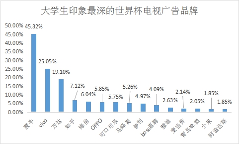 在提到世界杯期间印象最深的电视广告品牌时,45.32%的受访者表示对蒙牛投放的世界杯广告印象最深,其次是vivo,约占25.05%。在受访者广告印象最深的前14个品牌名单中,包括蒙牛、vivo、万达、海信、可口可乐、雅迪、麦当劳和阿迪达斯等7家FIFA官方赞助商,以及知乎、OPPO、马蜂窝、伊利、boss直聘、青岛啤酒、小米等7家中央电视台赛事转播合作伙伴和赞助商。