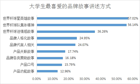 品牌营销的关键在于讲好品牌故事。在各种各样的世界杯广告的品牌故事创意讲述方式中,受访者最认可的方式是讲述世界杯球星英雄故事和世界杯球队集体精神,二者分别占57.02%和56.14%,另外在品牌广告创意中采用讲述球迷情感故事的方式也得到了相当规模的认同,约占36.26%。