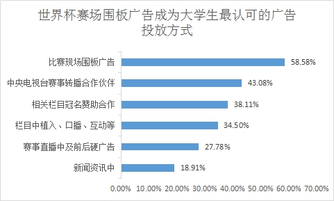 中国品牌在2018世界杯期间的广告投放与营销形式多种多样,其中大学生最认可的广告投放方式为在比赛现场投放围板广告,约占58.58%,其次43.08%的受访者认同品牌通过成为中央电视台赛事转播合作伙伴的方式投放广告,受访者最不认可的广告投放方式为在新闻资讯中投放广告,约占18.91%。