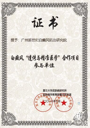 广州新世纪白癜风医院被授予 《白癜风遗传及精准医学》 合作项目参与单位