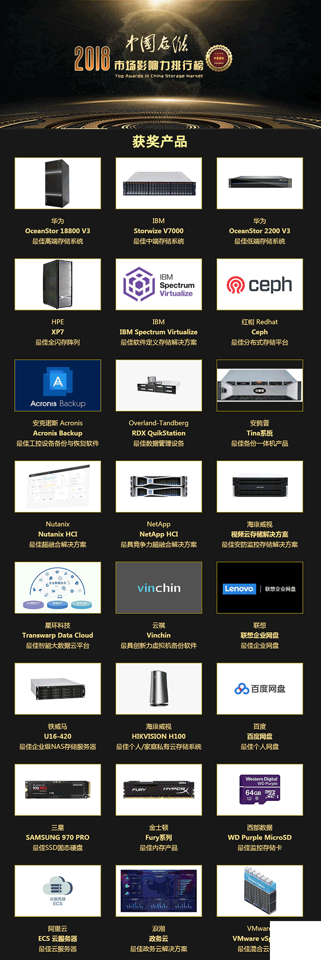 2018年度最佳产品奖项涵盖了存储设备、管理软件、容灾备份、云计算、大数据、企业及个人存储类产品等众多类目,华为 OceanStor 18800 V3高端存储系统、HPE XP7全闪存阵列、IBM Spectrum Virtualize软件定义存储解决方案、安克诺斯 Acronis Backup备份与恢复软件、联想企业网盘、三星 SAMSUNG 970 PRO固态硬盘、浪潮政务云等均在各自领域脱颖而出。