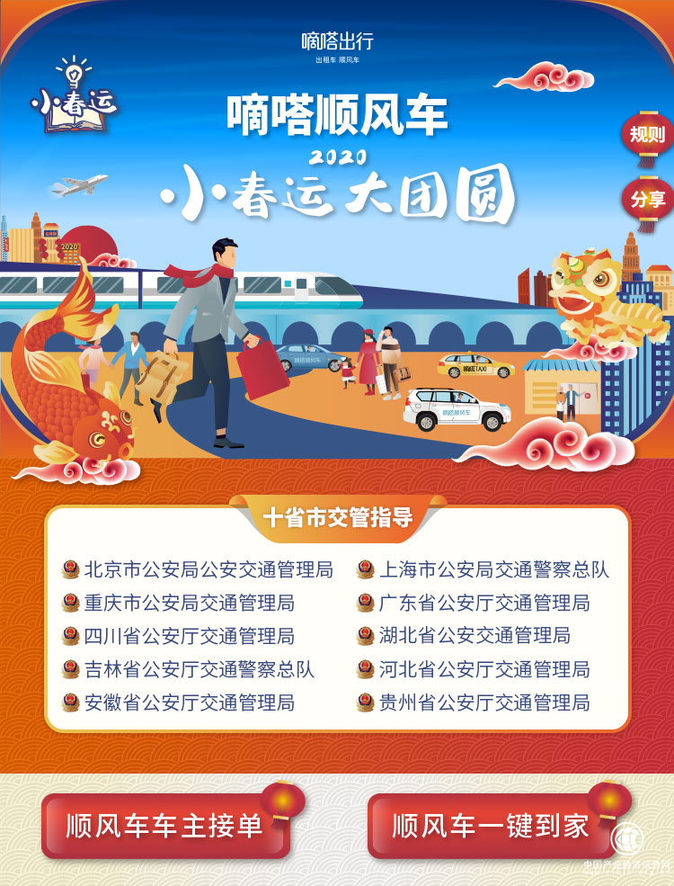 2020年1月10日,在十省市交管的联合指导下,超50家媒体的联合公益支持下,嘀嗒顺风车第五届春运活动正式启动,今年顺风车春运活动的主题为“嘀嗒顺风车·2020·小春运.大团圆”。目前嘀嗒出行的春运频道已经上线,用户不仅可以通过春运频道进行下单预约,还可享受多重惊喜福利,欢欢喜喜过大年。