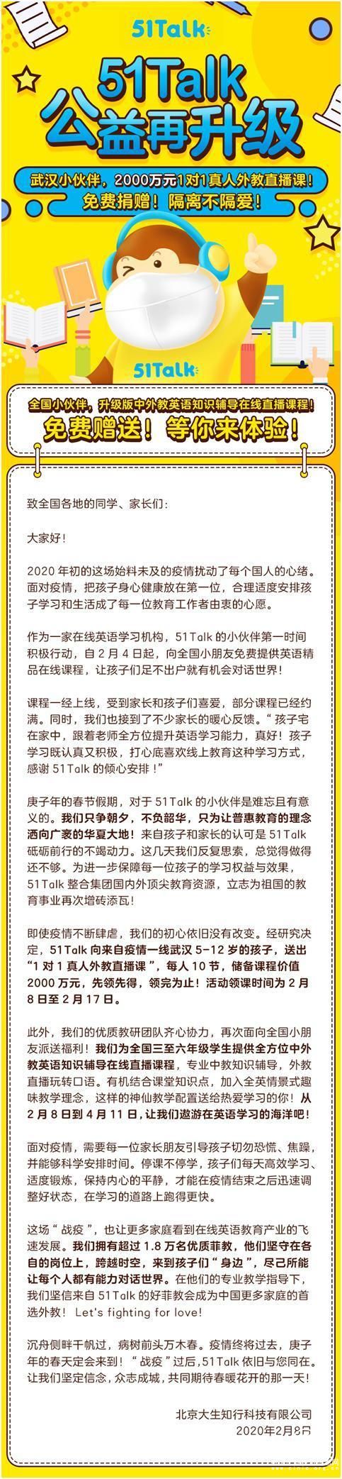 2月8日,51Talk公益再升级,向武汉地区小朋友赠送价值2000万元的1对1真人外教直播课。