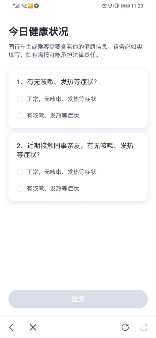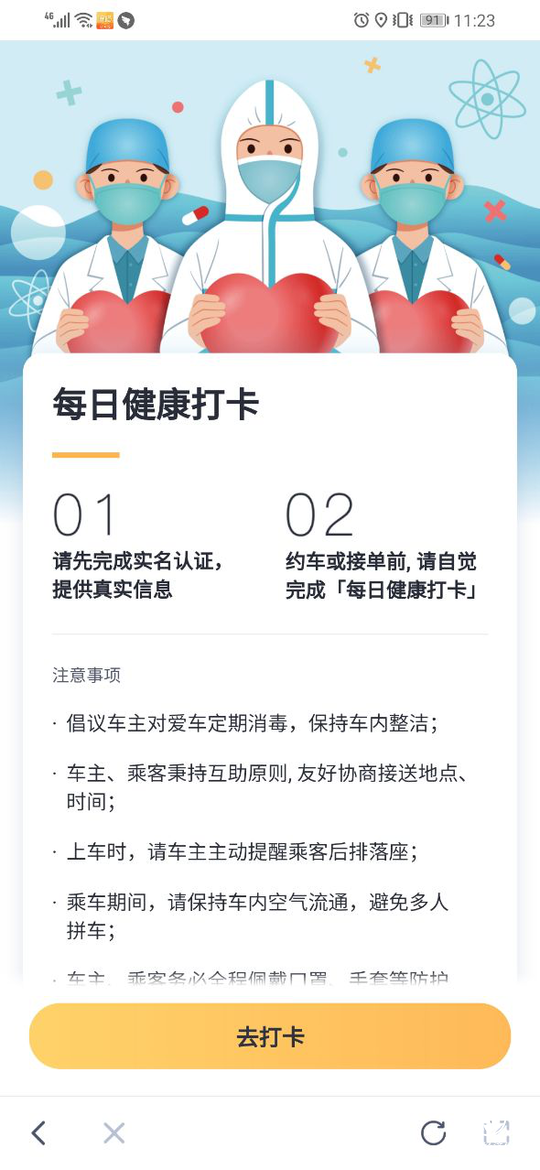 2、 约车或接单前,请自觉完成“每日健康打卡”