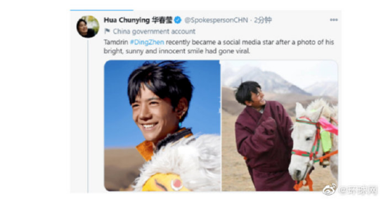 29日晚消息,华春莹连发三推,为最近火爆全网的藏族小伙丁真“打call”