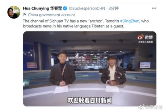 不仅如此,华春莹还介绍起丁真的“新形象”:“四川广播电视台有了位新‘主播’。作为嘉宾的丁真用他的母语藏语播报新闻。”
