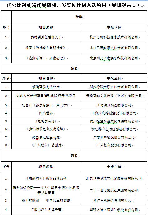 在国家新闻出版署指导和中央文化产业发展专项资金支持下,中国版权保护中心受托配套开展奖励计划,邀请来自动漫版权管理部门、动漫行业协会、版权公共服务机构、动漫教育研究机构、动漫企业等方面的多名专家针对国家新闻出版署征集推荐的160个优秀项目,根据评选规则,在经过项目申报、材料审核、专家评审、结果公示等程序后,最终评选出78个优秀项目,其中内容开发类金奖5名、银奖10名、铜奖22名,品牌经营类金奖3名、银奖8名、铜奖24名,海外市场开拓类金奖1名、银奖2名、铜奖3名。