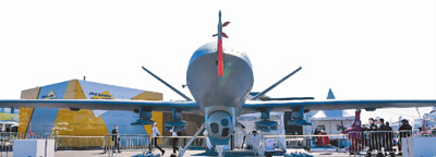 6月19日,在法国巴黎近郊的布尔歇,来宾参观中国航空工业集团公司带来的“翼龙II”无人机模型。 新华社记者 陈益宸 摄