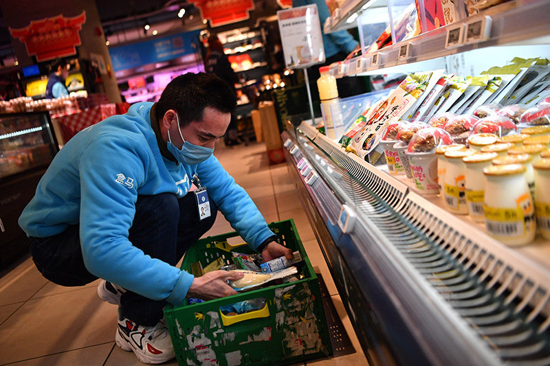 曹宏刚是云海肴餐饮管理有限公司位于西安一家门店的员工,目前他通过“共享员工”模式进入盒马鲜生,在西安的营业点工作(2月6日摄)。新华社记者 张博文 摄