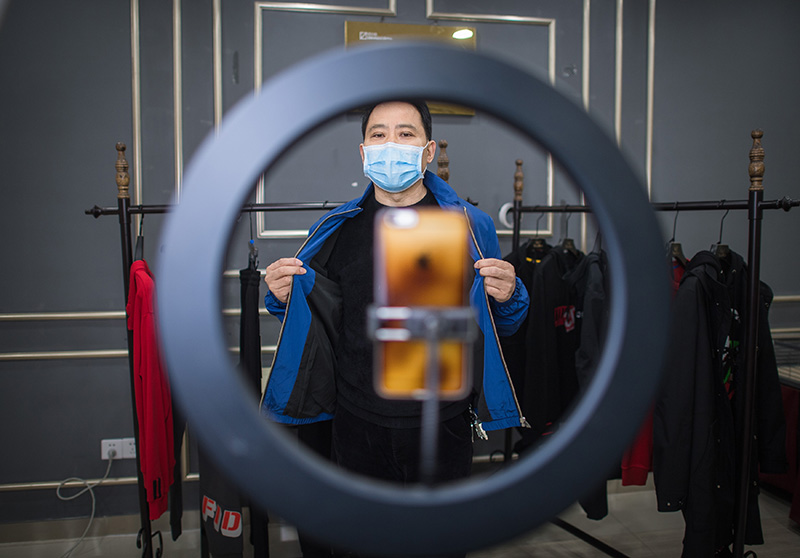 3月29日,在汉口北市场,一名主播在直播平台直播销售一款服装。新华社记者 肖艺九 摄