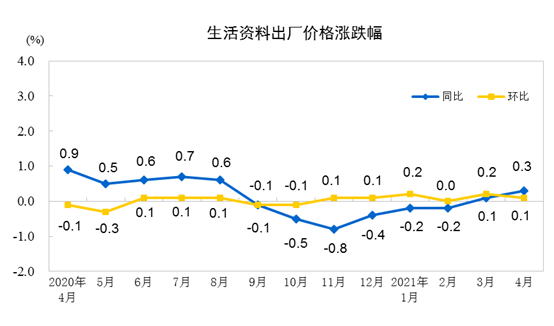 2021年4月份,全国工业生产者出厂价格同比上涨6.8%,环比上涨0.9%;工业生产者购进价格同比上涨9.0%,环比上涨1.3%。1—4月平均,工业生产者出厂价格比去年同期上涨3.3%,工业生产者购进价格上涨4.3%。