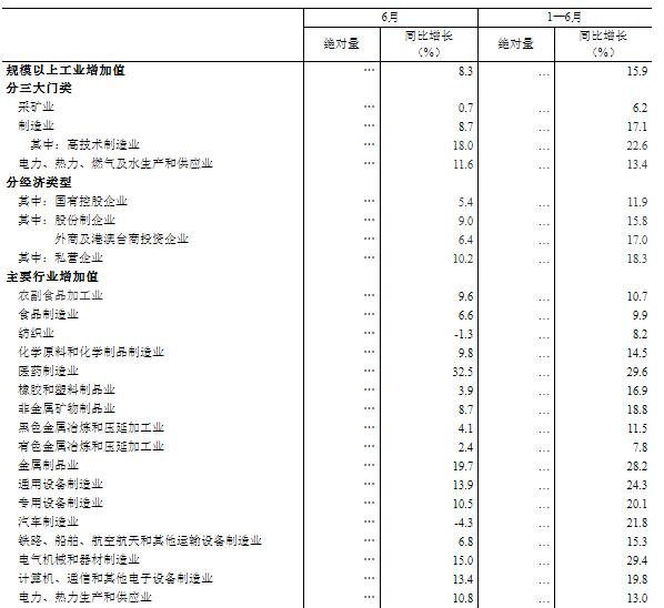 6月份,规模以上工业增加值同比实际增长8.3%(以下增加值增速均为扣除价格因素的实际增长率),比2019年同期增长13.5%,两年平均增长6.5%。从环比看,6月份,规模以上工业增加值比上月增长0.56%。1—6月份,规模以上工业增加值同比增长15.9%,两年平均增长7.0%。