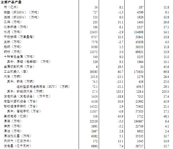 分产品看,6月份,612种产品中有410种产品产量同比增长。钢材12072万吨,同比增长3.0%;水泥22433万吨,下降2.9%;十种有色金属549万吨,增长8.0%;乙烯233万吨,增长31.1%;汽车203.8万辆,下降13.1%,其中,新能源汽车27.3万辆,增长135.3%;发电量6860亿千瓦时,增长7.4%;原油加工量6082万吨,增长5.1%。