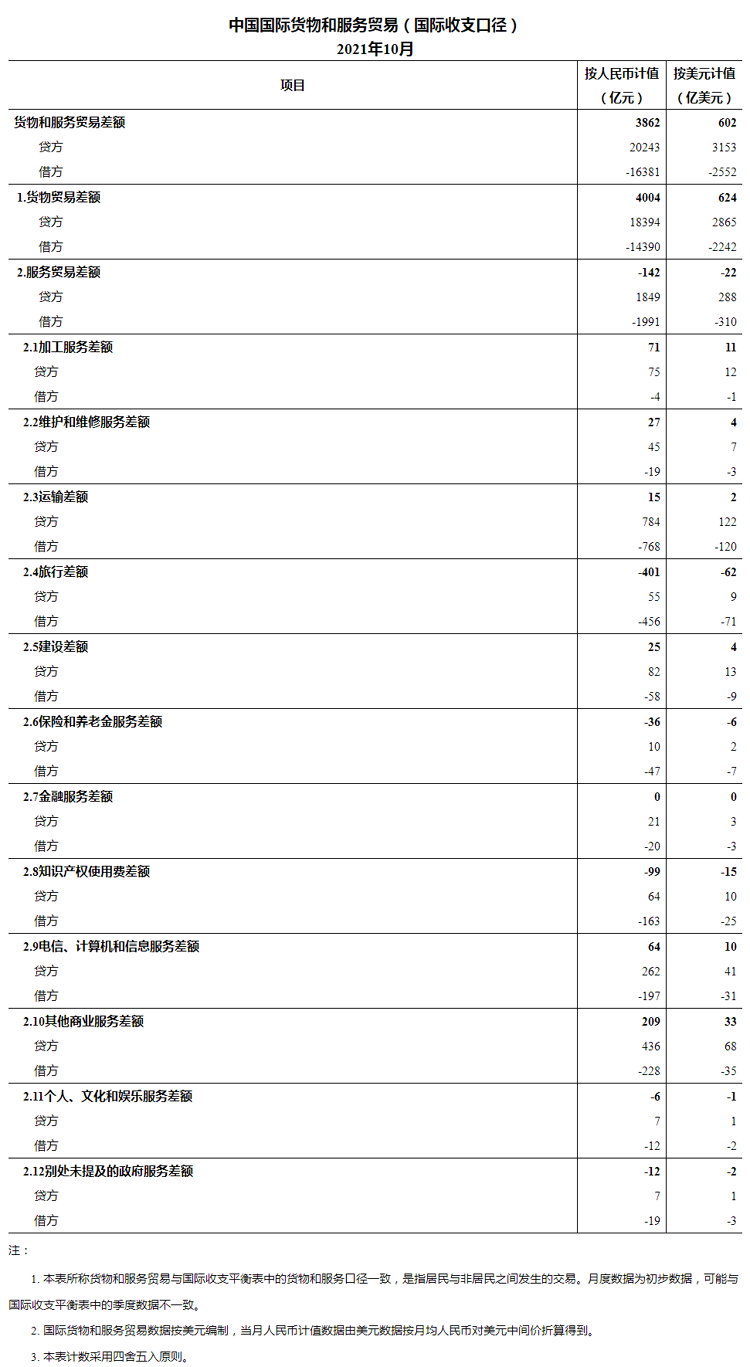 按美元计值,2021年10月,我国国际收支口径的国际货物和服务贸易收入3153亿美元,支出2552亿美元,顺差602亿美元。其中,货物贸易收入2865亿美元,支出2242亿美元,顺差624亿美元;服务贸易收入288亿美元,支出310亿美元,逆差22亿美元。