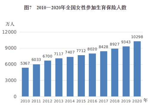 1.女性生育保险[9]覆盖面明显扩大。《纲要》实施期间,覆盖全体妇女的生育保障制度体系逐步建立,生育保险和职工医疗保险合并实施全面推进,基金共济能力明显增强;未就业妇女生育医疗费用通过城乡居民医疗保险解决政策的实施,实现了生育医疗费用保障的全覆盖。2020年末,女性参加生育保险的人数为1.03亿人,比2010年增加4931万人,是2010年的1.9倍(见图7)。