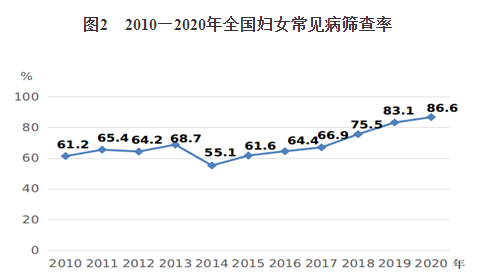 4.妇女生殖健康服务水平明显提高。《纲要》实施以来,国家免费孕前优生健康检查项目全面实施,孕前风险防范意识不断增强;生殖健康知识大力普及,妇女自我保健意识和能力大幅提高。2020年,全国共为867万名计划怀孕夫妇提供免费检查,目标人群覆盖率平均达96.4%,筛查出的风险人群全部获得针对性的咨询指导和治疗转诊等服务。2020年,妇女常见病筛查率达到86.6%,比2010年提高25.4个百分点,实现《纲要》“达到80%以上”的目标(见图2)。