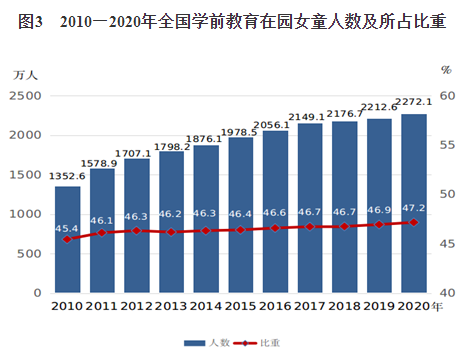 1.女童平等接受学前教育得到切实保障。《纲要》实施以来,我国连续实施三期学前教育行动计划,多种形式增加学前教育资源,切实保障女童平等接受学前教育的权益。2020年,全国共有学前教育(包括幼儿园和附设幼儿班)在园女童2272.1万人,比2010年增加919.5万人,增长68%,增速比全部在园儿童高6.1个百分点;接受学前教育的女童所占比重为47.2%,比2010年提高1.7个百分点(见图3)。2020年,全国学前教育毛入园率为85.2%,远高于《纲要》“达到70%”的目标。