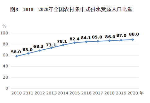3.农村人居环境持续改善。2018年,中央农办等18个部门联合印发《农村人居环境整治村庄清洁行动方案》,启动并实施村庄清洁行动,目前农村人居环境整治三年行动方案目标任务全面完成。全国95%以上的村庄开展了清洁行动,村民的环境与健康意识进一步增强,村庄环境趋于干净整洁。2020年,农村集中式供水受益人口比重达到88.0%,比2010年提高30个百分点,实现《纲要》“达到85%左右”的目标(见图8)。