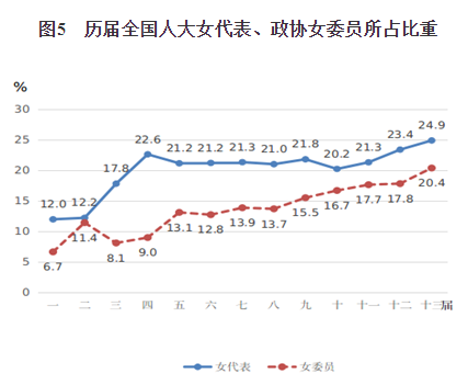 1.全国女人大代表和女政协委员占比均达历史最高。《纲要》实施以来,我国积极推动和支持妇女参政议政,妇女参与决策和管理的比例明显提高,妇女的政治权利得到有力保障和加强。2018年召开的第十三届全国人民代表大会共有女代表742名,占代表总数的24.9%,比第十一届(2008年)提高3.6个百分点,是历届人大代表中女性比重最高的一届(见图5)。政协第十三届(2018年)全国委员会中有女委员440人,占委员总数的20.4%,比第十一届(2008年)提高2.7个百分点,也是历届政协委员中女性比重最高的一届(见图5)。
